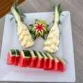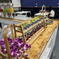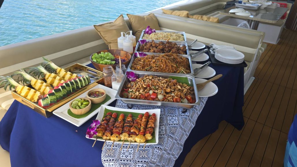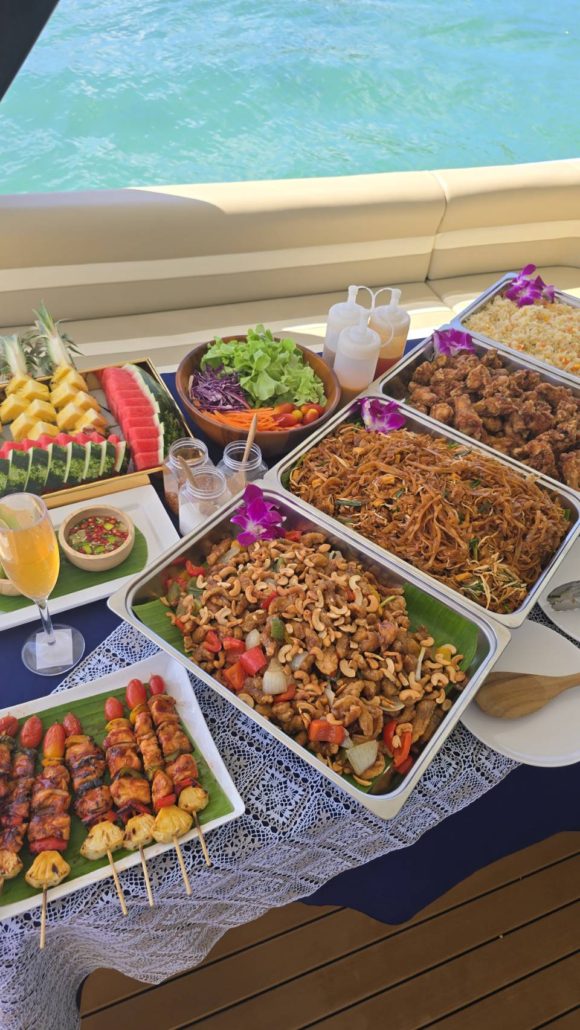 Abendessen bei Sonnenuntergang. Genießen Sie köstliche thailändische Küche in malerischer Umgebung, im Licht der untergehenden Sonne.